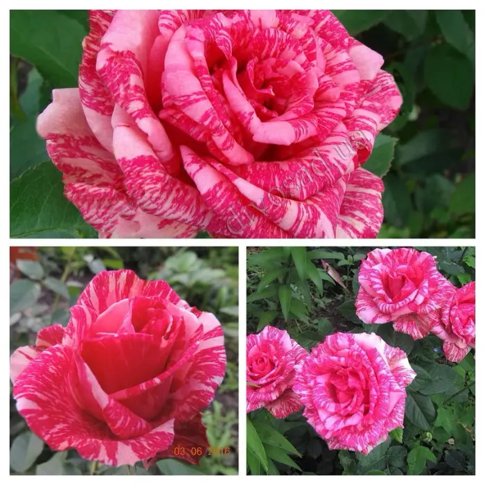 Роза чайно-гибридная Pink Intuition. Бутоны густо махровые, достаточно крупные, достигающие в диаметре от 10 до 12 см, с приятным ароматом. Их расцветка напоминает структуру мрамора. Этот визуальный эффект возникает в результате удачного сочетания нежно розового фона с ярко-розовыми, или даже малиновыми полосками, создающими впечатление, что кто-то небрежно, на скорую руку, взмахнул кистью, нарисовав их на идеально подходящем фоне. Цветение одиночное (по одному цветку на цветоносе). Высота куста 70-100 см, ширина 50-60 см.