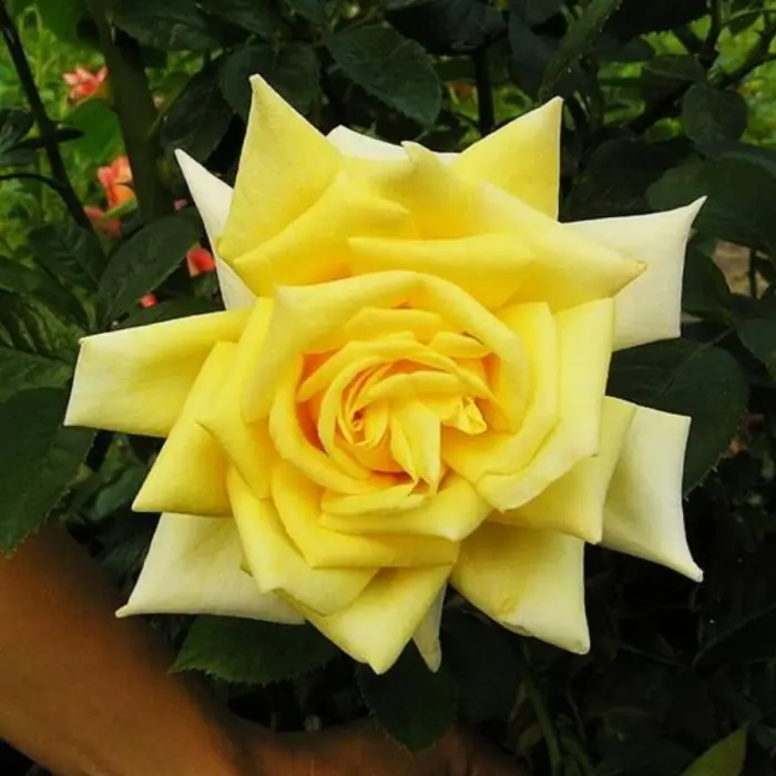Роза чайно-гибридная Starlite. Лимонно-желтые или желтые цветки приблизительно из 30 лепестков, диаметром около 9-10 см, с более светлыми внешними лепестками, закручивающимися на внешнюю сторону при роспуске цветка, на побегах в основном одиночные, с легким ароматом аниса, хорошо держат дождь. При отцветание цветок светлеет до светло-желтого и почти белого, становится рыхлым, показывает серединку. Куст высотой 100-150 см, шириной 80 см. Цветение обильное. Хорошая устойчивость к заболеваниям.