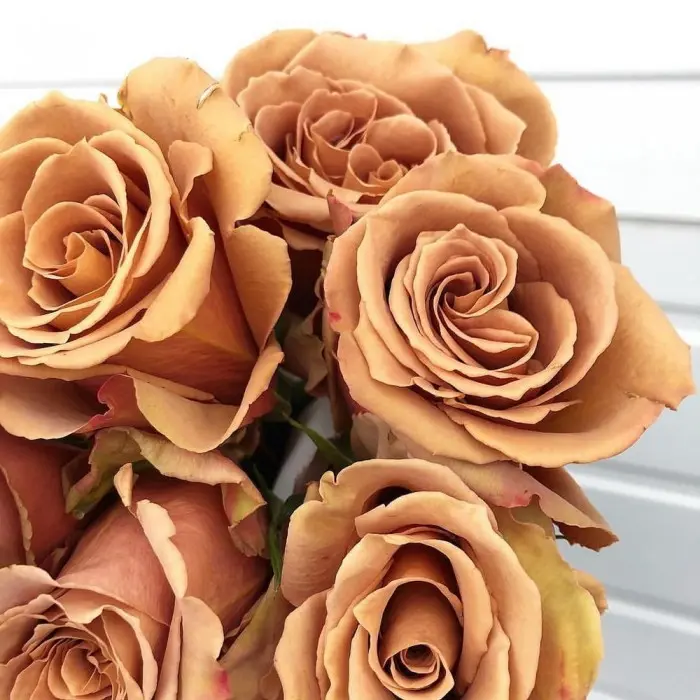 Уникальная окраска. Куст сильнорослый с длинными, прочными и прямыми цветоносами. Цветки крупные, собраны из плотных лепестков кофейно-карамельной окраски. Имеет очень легкий, почти не ощутимый аромат. Практически не повреждается дождем, ветром и ярким солнцем, устойчива к заболеваниям. Бутоны долго остаются декоративными на растении, в срезке цветы не осыпаются до 10 дней. В течение сезона формирует 2-3 волны цветения.