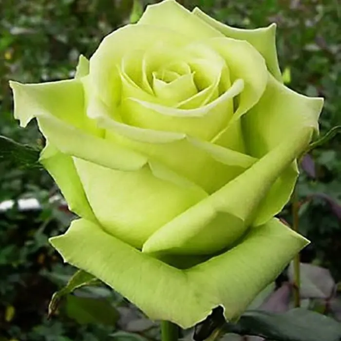 Роза чайно-гибридная Green Tea. Основная окраска лепестков бледно-зеленого цвета, их форма округлая, со слегка волнистым краем. Именно эта волнообразная кайма создает видимость махрового цветка. При раскрытии бутона цветок по форме напоминает глубокую чашу. Листья глянцевые, крупные, темно-зеленого цвета.