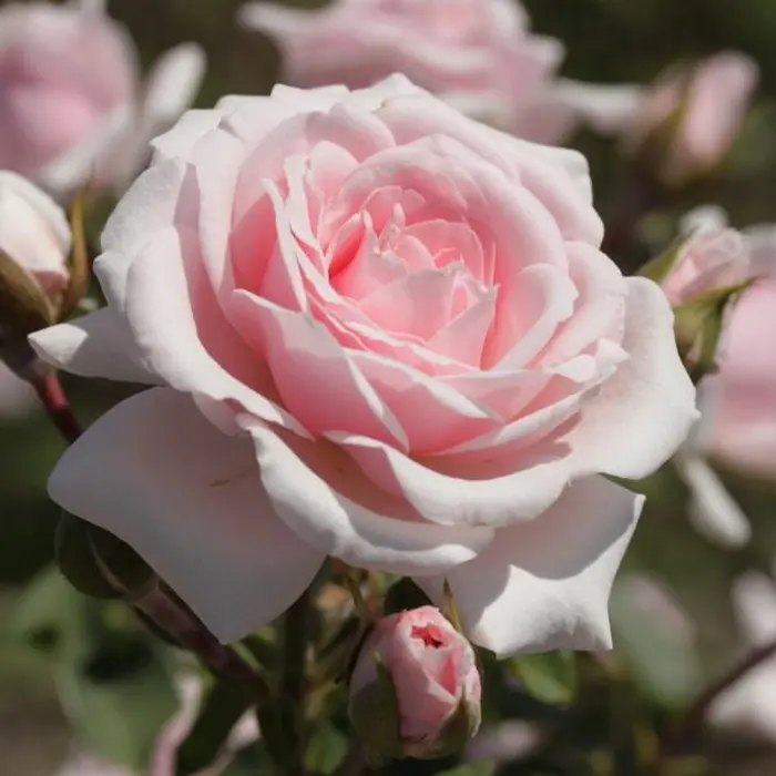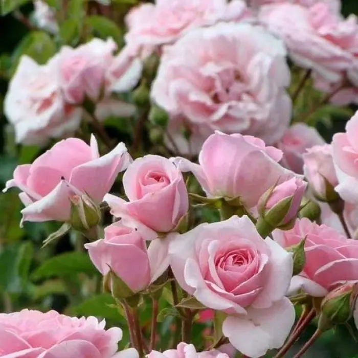 Роза флорибунда Diadem. Хорошая невысокая флорибунда, очень обильноцветущая, устойчивая к влажной погоде, и особенно популярная в северной Европе. Цветки красивого нежно-розового цвета, выгорают до почти белых. Оборотная сторона лепестков всегда темнее, и цветки густомахровые и чашевидные, так что контраст между светлым «верхом» и темным «низом» хорошо виден, и придает дополнительную привлекательность сорту. Цветки появляются в небольших кистях, обычно по 3-5 шт, поникающих под собственным весом. Куст ветвистый, прямостоячий, компактный, с темной, устойчивой к болезням листвой. Очень зимостоек. Высота куста 120-150 см, ширина до 120 см. Размер цветка 6-7 см.