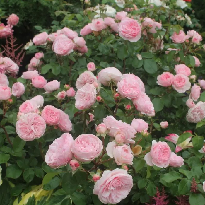 Роза флорибунда Mariatheresia. Роза буквально усыпана цветками квартированной формы с легким ароматом. Цветки мягкого нежно-розового цвета, густомахровые (65-70 лепестков), ностальгические, собраны в зонтиковидные соцветия по 3-5 штук. Куст компактный, с темно-зеленой, блестящей листвой, контрастирующей с превосходными цветками. Диаметр цветков: 7-8 см. Высота куста: 70-90 см. Аромат: легкий.