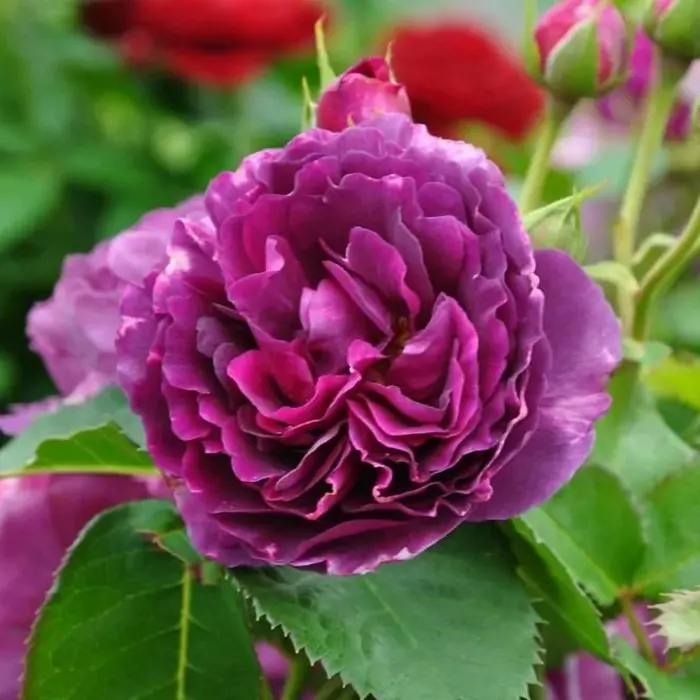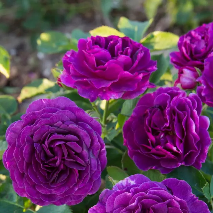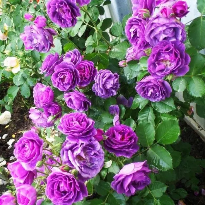 Роза флорибунда Minerva. Бутоны необычных тёмно-сиреневых оттенков, а распустившиеся махровые цветки приобретают светло-синие оттенки и выделяются своими золотисто-желтоватыми тычинками. Основной окрас цветков – насыщенный сиреневый, фиолетовый. Размеры цветков в диаметре – до 6-8 см, а количество лепестков в цветках – 26-40. Источают интенсивный и сладкий аромат. Это повторноцветущая роза, с длительным периодом цветения. Кусты достигают высоты в 70-80 см и 70-100 см ширины. Крупные, матовые листочки имеют тёмно-зелёный окрас. Цветение обильное непрерывное с июня до заморозков. Листва большая, матовая, очень устойчивая к болезням. Сорт получил награды за аромат в Саверне в 2008 г. и в Мадриде в 2011 г.