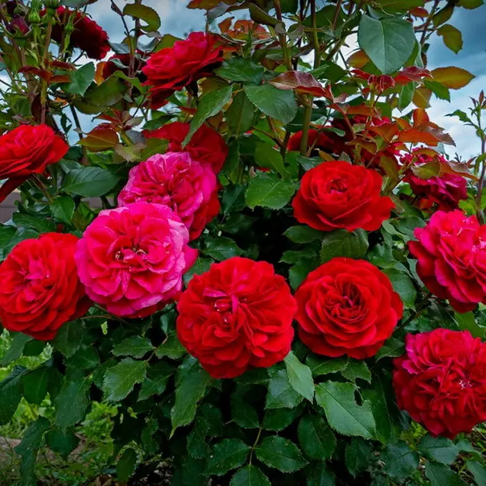 Роза флорибунда Mona Lisa. Роза флорибунда из серии "Романтика" темно-красного цвета, махровая 80-82 лепестка. На ветке 3-5 цветков с нежным ароматом. Цветет практически непрерывно до поздней осени. Листва на кусте мелкая, плотная, глянцевая. Роза очень устойчивая к заболеваниям и вредителям. Морозоустойчивая. Диаметр цветков: 10-12 см. Высота куста: 50-80 см. Ширина куста: 50-60 см. Аромат: слабый. Период цветения: повторноцветущая. Устойчивость к заболеваниям: черной пятнистости - высокая, мучнистой росе - высокая.