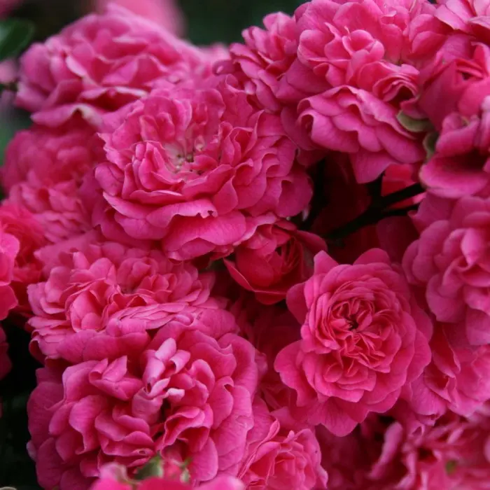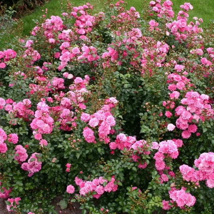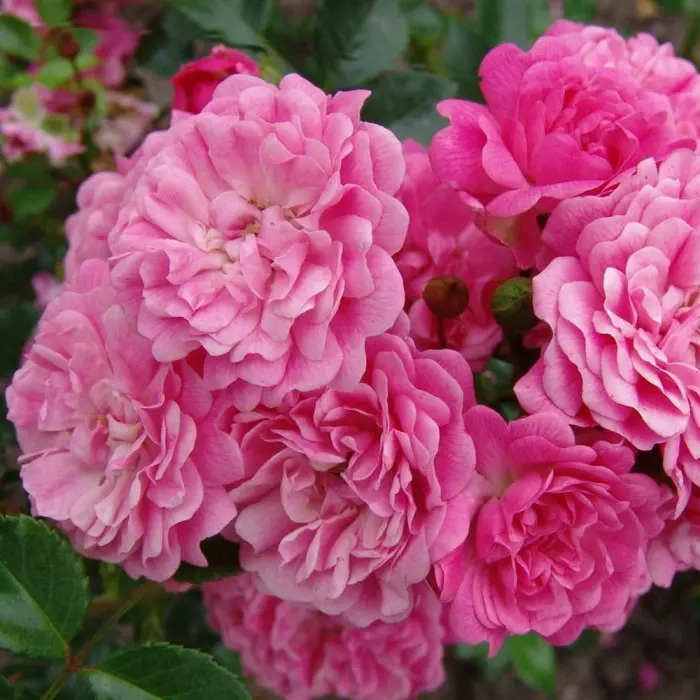 Роза флорибунда Pepita. Густомахровые ярко-розовые цветки, в полном роспуске показывающие серединную пуговку. Цветки расположены группами, в соцветиях по 6-8 шт. Размер цветка 3-4 см. Высота растения 50 см, ширина 40 см. В любую погоду эти розы будут радовать вас своим очаровательным ароматом и красивым окрасом. Сорт - один из наиболее устойчивых, неприхотливых и надежных. Сами цветки и листва практически никогда не поражаются черной пятнистостью и мучнистой росой, хорошо держат жару и дождь. Роза повторноцветущая.