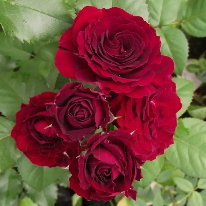 Роза флорибунда Red Sensation. Цветки темно-красные, махровые (около 40 лепестков) диаметром 4-5 см, в роспуске показывают серединку с ярко-желтыми тычинками. Листья тёмно-зелёные, жёсткие, крепкие, полностью устойчивые к мучнистой росе и чёрной пятнистости. Кусты густые, сильно разветвлённые, шипов нет, высотой 40- 60 см