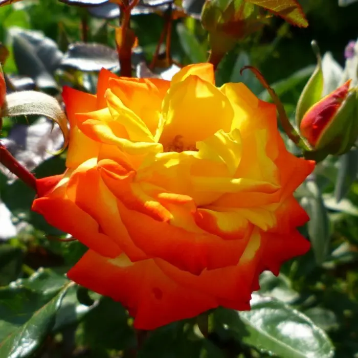 Роза флорибунда Samba. Куст среднерослый, прямой, хорошо облиственный. Листья крупные, кожистые. Цветки золотисто-желтые с оранжево-красной каймой по краям, средние (6-7 см), махровые. Цветет обильно, продолжительно. Зимостойкий.