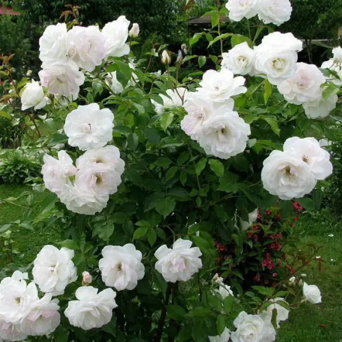 Роза флорибунда Schneewittchen. Ароматные, махровые цветки, снежно-белые, в полном роспуске с открытой серединкой, собраны в кисти. В соцветиях по 3-8 шт. Аромат лёгкий. Кусты густые, слабораскидистые. Сорт зимостойкий, среднеустойчивый к болезням. Устойчивость к дождю: средняя. Диаметр цветков:6-7 см. Высота куста: 100-150 см. Ширина куста: 100 см. Цветение обильное, повторное. Зона зимостойкости: 5 (-29 °С).