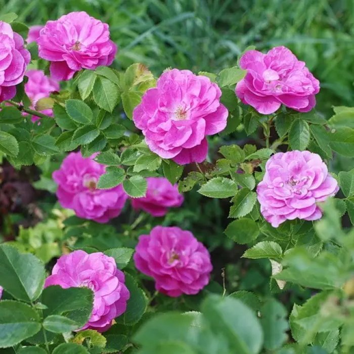 Роза канадская Charles Albanel Размер цветка 7-8 см. Высота 60-75 см. Ширина 125 см. Это полумахровый, фуксиево-розовый гибрид ругозы, происходящий от кремово-белого Souvenir de Philemon Cochet. Цветки с красивым пучком золотых тычинок в центре появляются в кистях по 3-7 шт, за ними следуют крупные округлой формы плоды. Листва типична для ругозы – бледно-зеленая, морщинистая, устойчивая к заболеваниям. Побеги очень колючие. Куст имеет тенденцию разрастаться больше вширь, чем вверх. Цветет обильно, довольно рано, затем появляются отдельные цветки до самых морозов. Зона зимостойкости 4. Период цветения- повторноцветущая.