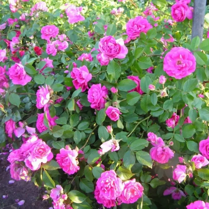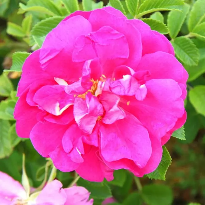 Роза канадская David Thompson. Гибрид розы ругозы. Цветки диаметром до 7 см, полумахровые (25 лепестков), от тёмно-розовых до малиновых с белыми потёками и жёлтыми тычинками, в соцветиях по 3-7. Аромат сладкий, сильный. Цветение непрерывное, в течение сезона. Листва глянцевая, морщинистая, высокоустойчивая к заболеваниям. Куст колючий, пряморослый, округлый, высотой и шириной 90-120 см. Зона зимостойкости 3 (-34 градуса)
