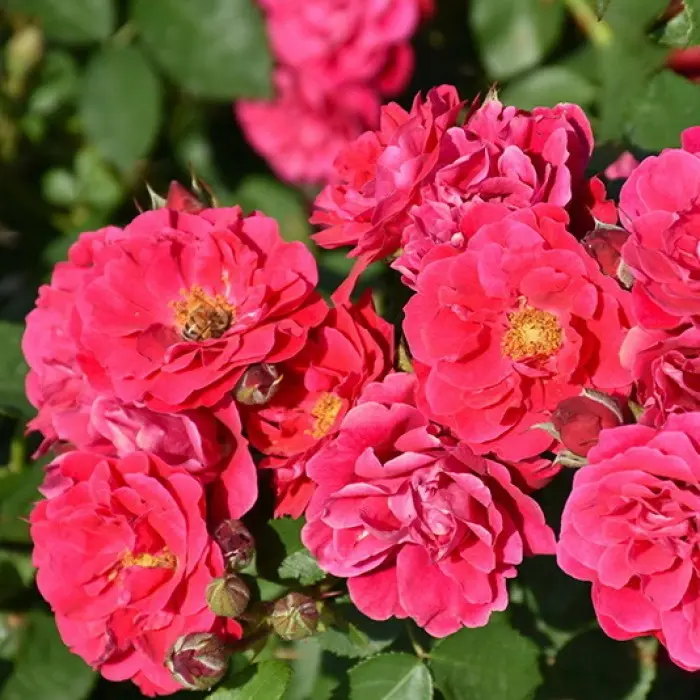 Роза канадская Frontenac Размер цветка 7-8 см. Высота 100-120 см. Ширина 100 см. Цветки розы Frontenac малиновые, у основания лепестка белое пятнышко. Этот сорт розы интересен тем, что во время цветения меняет свой окрас. А когда лепестки раскрываются полностью, центральная более светлая часть цветка красиво контрастирует с более яркими лепестками. Раскрываясь цветок показывает светлую серединку с темными тычинками в центре. Цветки полумахровые, чашевидные. Цветки появляются в кистях по 3-5 шт, практически без перерыва до самых морозов. Листва темная, блестящая, устойчива к заболеваниям, куст густой, ветвистый. Форма цветка: чашевидная. Зона зимостойкости 2 (до -45?С).