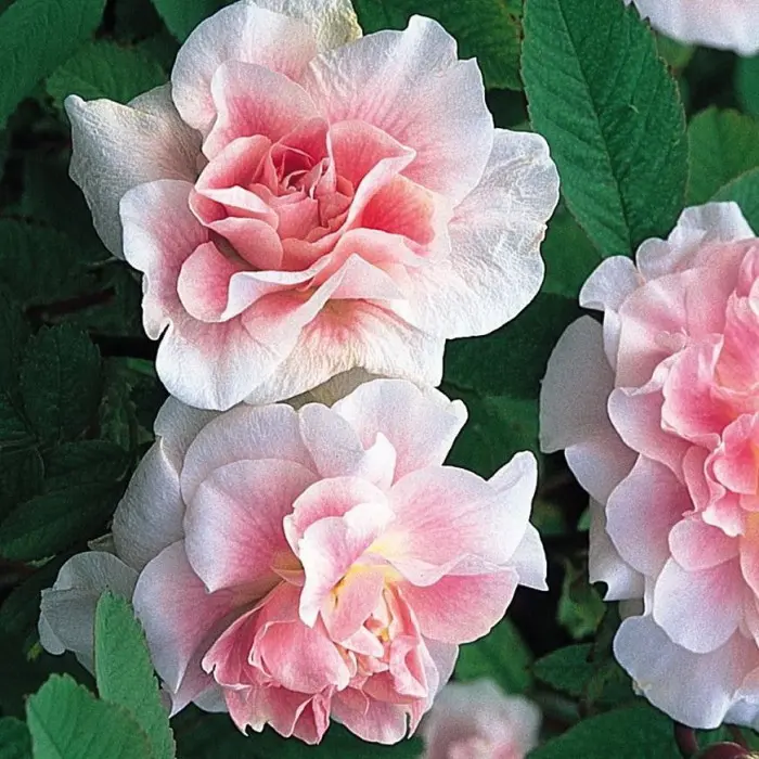 Роза канадская Martin Frobisher Размер цветка 5-6 см. Среднее кол-во лепестков 30. Высота 150-180 см. Ширина 100-120 см. Одна из лучших роз серии Explorer. Практически без шипов, нежного молочно-розового цвета, с оборотной стороны лепестки розы почти белые, они загибаются внутрь, формируя в центре пуговку. Цветки обычно появляются в кистях по 3-5 шт, на довольно длинных изящных стеблях и хороши для срезки. К сожалению, они коричневеют, прежде чем сбросить лепестки. Плоды не образуются. Листья матовые серо-зеленые, здоровые. Куст прямостоячий, сильнорослый, цветет обильно в первую волну, а затем практически непрерывно до первых морозов. Также прекрасно себя чувствует в жарком климате. Сорт устойчив к болезням, особенно к мучнистой росе. Зона зимостойкости 2.