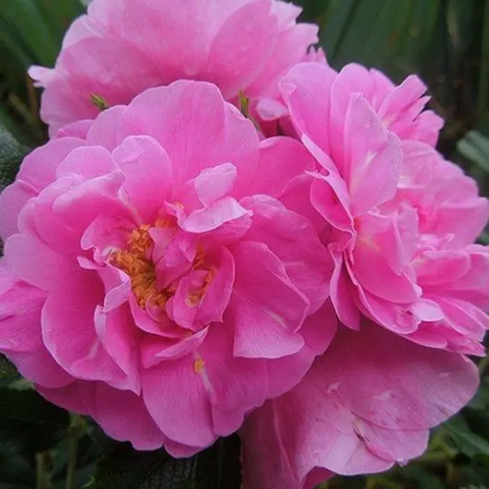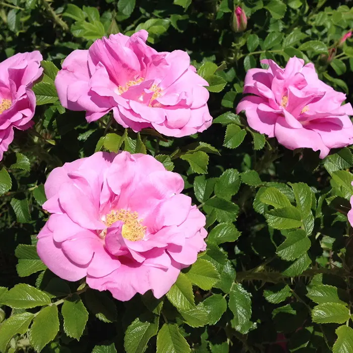Роза канадская Jens Munk. Гибрид розы ругозы. Цветки диаметром 7-8 см, полумахровые (25 лепестков), мягкого розового тона с лёгким сиреневым оттенком и жёлтыми тычинками, в соцветиях. Аромат лёгкий. Первое цветение обильное, затем до осени менее обильное. Листва высокоустойчивая к мучнистой росе и чёрной пятнистости, среднеустойчивая к ржавчине. Куст пряморослый, высотой 120-200 см и шириной 120-150 см. Побеги дуговидные, колючие. Осенью кусты также привлекательны, благодаря красным плодам и небольшому количеству цветков. Зимостойкость 3 зона (-34 градуса)
