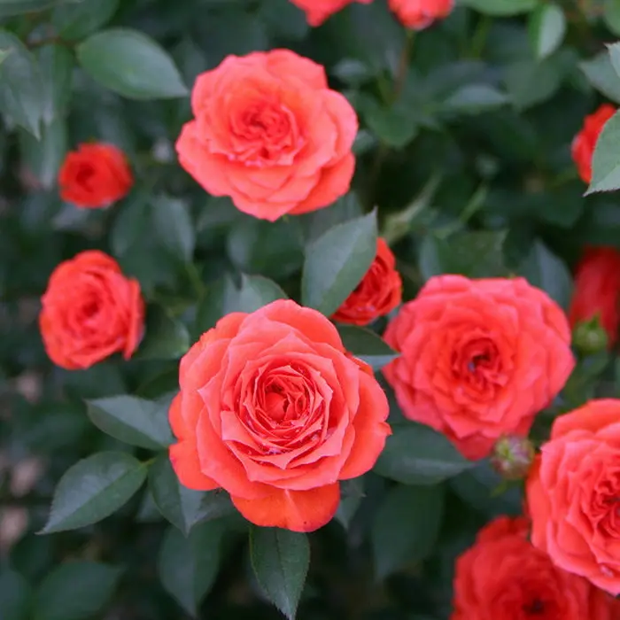 Роза миниатюрная Orange Juwel. Цветки ярко-оранжево-красные, чашевидные, с рыхлым расположением заостренных лепестков, душистые, густомахровые - 26-40 лепестков, одиночные и в соцветиях, в полном роспуске показывают серединку с желтыми тычинками. Листья темно-зеленые, блестящие, кожистые. Кусты слегка раскидистые, с прочными цветоносами. Цветет обильно, почти непрерывно. Цветки дождем не поражаются, самоочищающиеся. Высота 30-50 см., ширина 30-40 см.