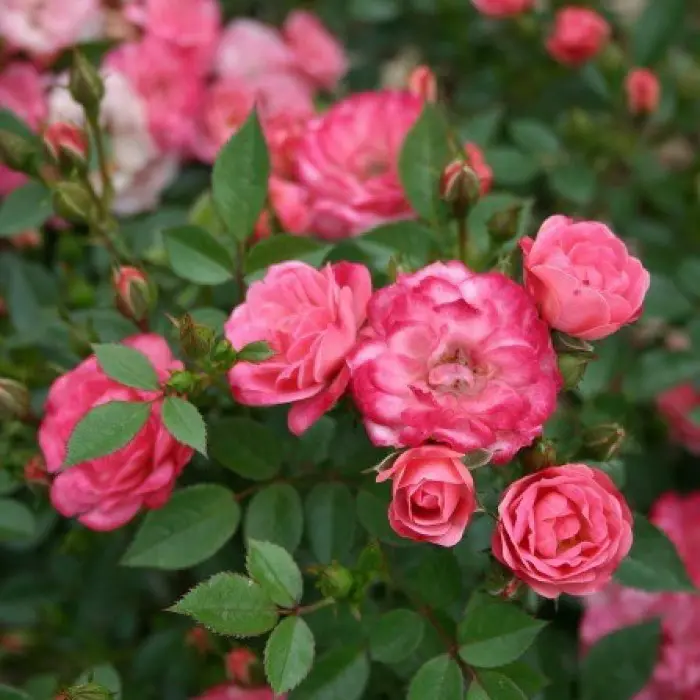 Роза миниатюрная Tiny Winy Цветки темно-розовые, чашевидные, диаметром до 4,5 см, махровые (40—45 лепестков), со слабым ароматом, одиночные и по 8—20 в соцветии. Кусты высокие (до 110 см), прямостоячие, густые. Листья светло-зеленые, мягкие, блестящие. Цветет обильно. Сорт весьма зимостойкий. Обладает повторным цветением.