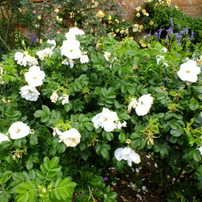 Роза rugosa Blanc Double de Coubert. Гибрид розы ругозы. Цветки великолепные, диаметром 7-8 см, полумахровые (10-20 лепестков), очень ароматные (даже ночью!). Лепестки чисто-белые с текстурой как у тонкой х/б ткани. Цветёт обильно в июне и редкими цветками летом и осенью. Цветки красиво контрастируют с морщинистыми, тёмными, матовыми, кожистыми листьями, которые очень красивы осенью. Также к осени образуются большие оранжево-красные плоды (ягоды шиповника). Кусты прямые с дугообразными серыми колючими побегами, столь же широки, как и высоки (120-150 см) и требуют для себя много места. Эффектно смотрится в качестве живой изгороди, в больших массивах и одиночно. Один из лучших гибридов ругозы, чрезвычайно выносливый, стойкий к болезням и вредителям. Зимует под устойчивым снежным покровом.
