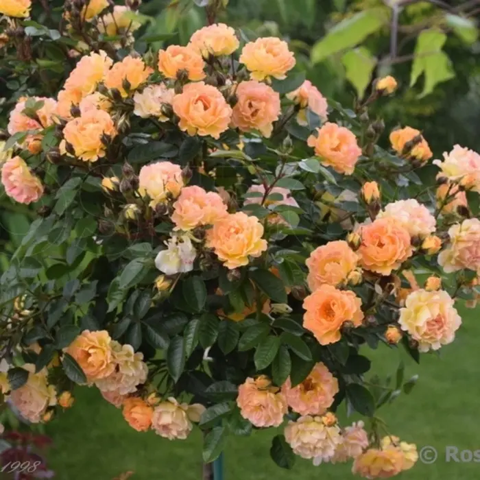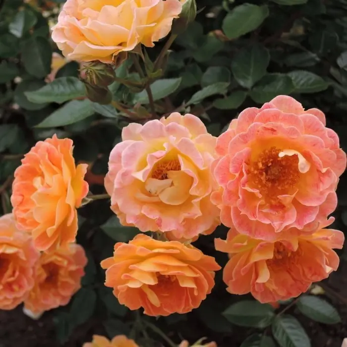 Роза Bessy. Полумахровые цветки от золотисто оранжевого до абрикосового цвета. Соцветия образуют бутоны шаровидной формы. Куст раскидистый, разветвленный. Листья темно-зеленые, глянцевые. Устойчивость к мучнистой росе и черной пятнистости средняя.Устойчивость к дождю средняя. Кол-во цветков на стебле: 3-5. Размер цветка: 4-5 см. Высота: 40-60 см. Ширина: 70 см.
