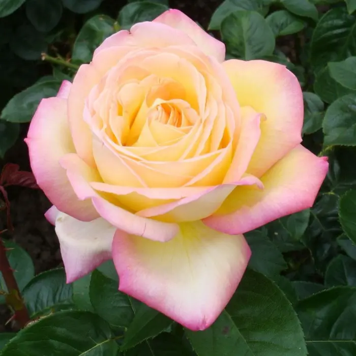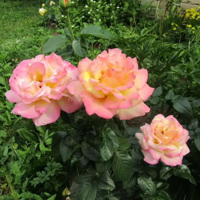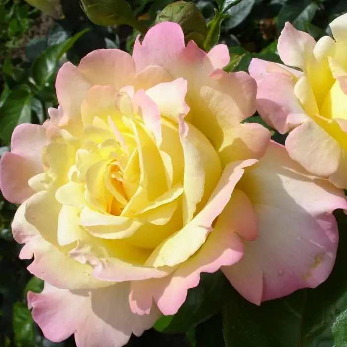 Роза чайно-гибридная Gloria Dei. Махровые розы с уникальным сочетанием лимонно-желтого и розового цветов. На начальной стадии распускания бутоны приобретают зеленовато-желтые оттенки, а в дальнейшем превращаются в золотисто-желтые с розовым налетом по краю лепестков. В конечном итоге края лепестков окрашиваются в более насыщенные розовые оттенки, а центр бутона остается желтовато-золотистым. Высота куста 120 см, ширина 90 см. Диаметр цветка 15 см.