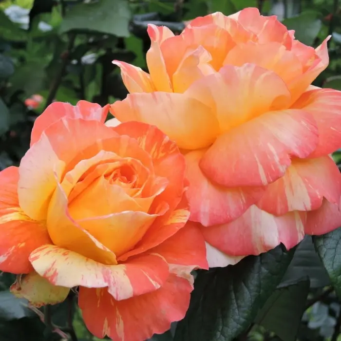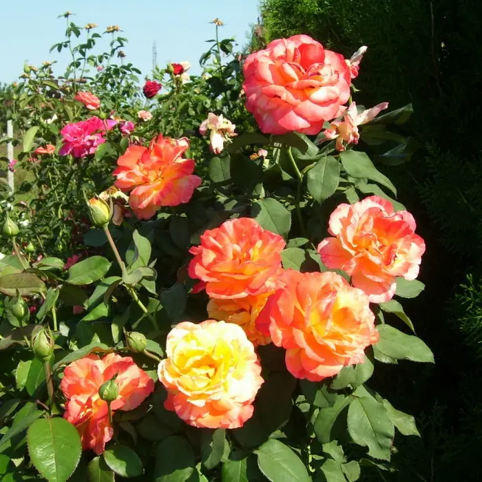 Роза чайно-гибридная Marvelle. Высота куста 100-150 см, ширина 80 см. Цветки темно-желтые, с красными и оранжевыми полосками, крупные, махровые размером 10-12 см. Цветки появляются по одному на длинных побегах, они ярко-желтые с оранжевыми полосками и потеками. Полоски лучше видны на внешней стороне лепестков - изнанка остается чисто-желтой. Позднее желтый цвет выгорает до кремового, а оранжевый становится малиновым, но цветок остается очень хорош.