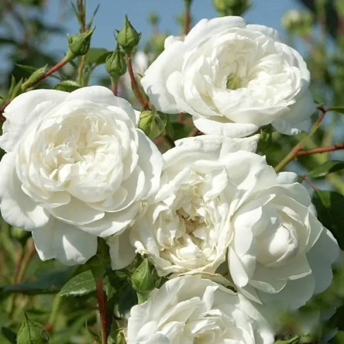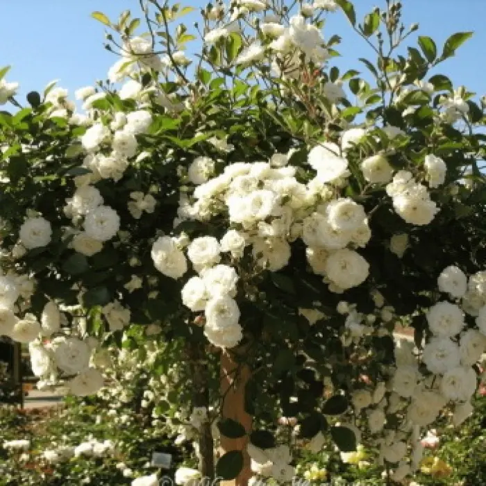 Роза на штамбе Swany. Саженец на штамбе с плакучей ветвистой кроной. Мелкие белые густомахровые цветки – собраны в пышные соцветия до полутора десятков в каждом. Роза Swany на штамбе, особенно красива, ее густо покрывает мелкая блестящая листва. Саженцы в саду - эффектные как акценты садового дизайна. Светлые сорта прекрасно сочетаются с любыми другими, поэтому особенно востребованы.