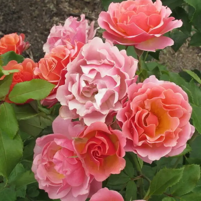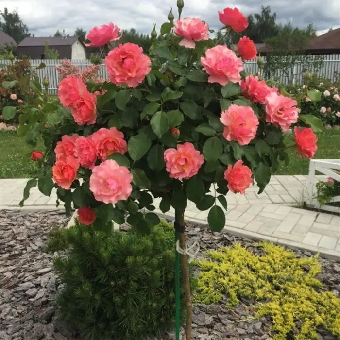 Роза на штамбе Jean Cocteau. Цвет меняется от розового до абрикосового, слегка выгорает на солнце до светло розового. Цветки полумахровые, чашевидные или плоские, с волнистыми лепестками. Цветение непрерывное с мая до заморозков, на одном цветоносе в период массового цветения насчитывается 2 — 5 цветков одновременно.