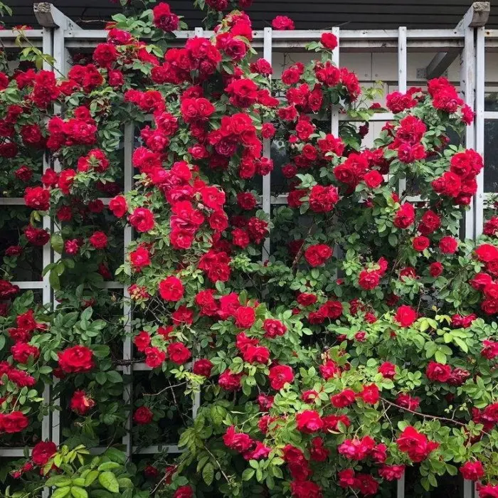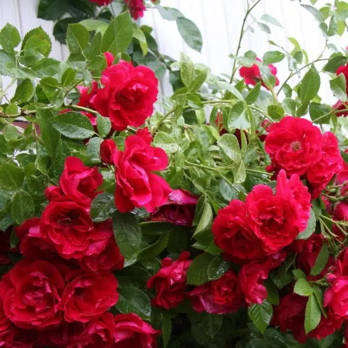 Роза Плетистая Flammentanz. Цветки густо-красные, яркие, стойкие, крупные (8 см), махровые (25—40 лепестков), слабо душистые, в соцветиях по 3—16. Листья темно-зеленые, очень крупные, кожистые. Кусты сильнорослые, доЗ м высотой. Цветение обильное в течение 30—35 дней. Зимостойкий. Устойчив к грибным болезням.