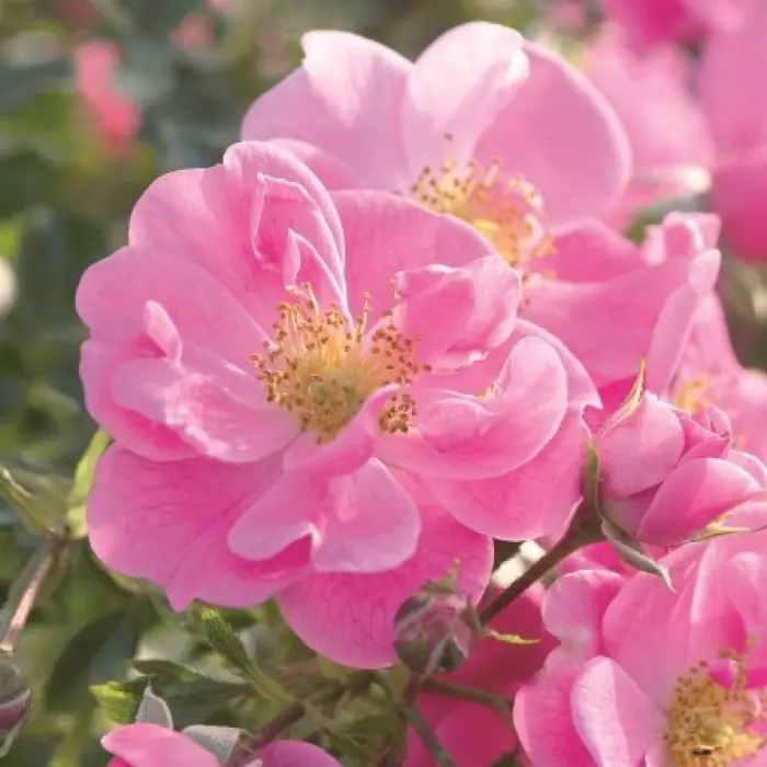Роза почвопокровная Bienenweide Rosa. Цветки диаметром 2-4 см, полумахровые, интенсивно розовые. Повторное цветение очень обильное, приводящее в восторг. Куст высотой 50-80 см, растёт немного шире и свободнее, чем типичная патио-роза, очень хороший эффект даёт в сочетании с многолетниками. Рекомендуется как контейнерное растение для террас, для посадки маленькими группами, для обсадки насаждений по периметру.