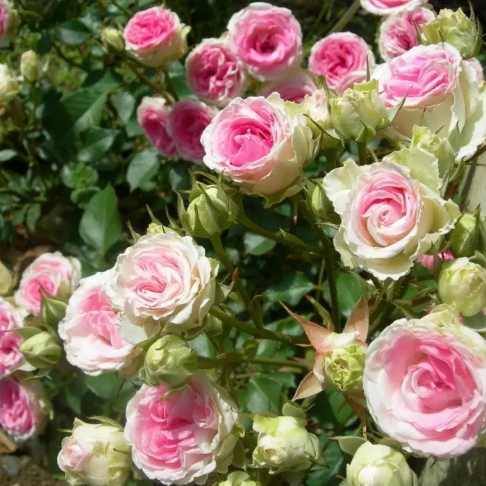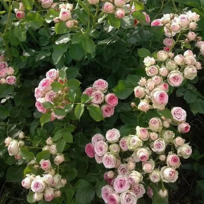 Роза почвопокровная Мими Эден. Высота куста: 35-50 см.; Диаметр куста: 40-50 см.; Диаметр цветка: 3-4 см.; Устойчивость к заболеваниям: 2/3; Погодоустойчивость: 2/3; Внутренние лепестки насыщенной нежно-розовой окраски, внешние - белые с зеленоватым оттенком. Цветение очень обильное и продолжительное, с июня до октября.