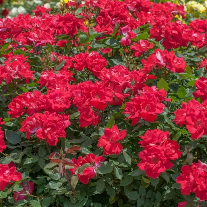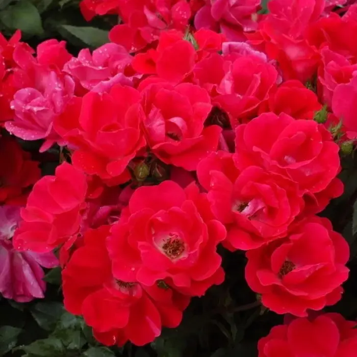 Роза почвопокровный шраб Knock Out. Цветок ярко малиново-фиолетовый, плоскочашевидный, полумахровый, 10 - 15 лепестков в одном цветке, диаметр цветка 7 - 8 см, обладает легким ароматом. Цветение обильное, непрерывное с июня по октябрь, особенно эффектно осенью, на одном цветоносе в период массового цветения насчитывается 5 - 15 цветков одновременно.