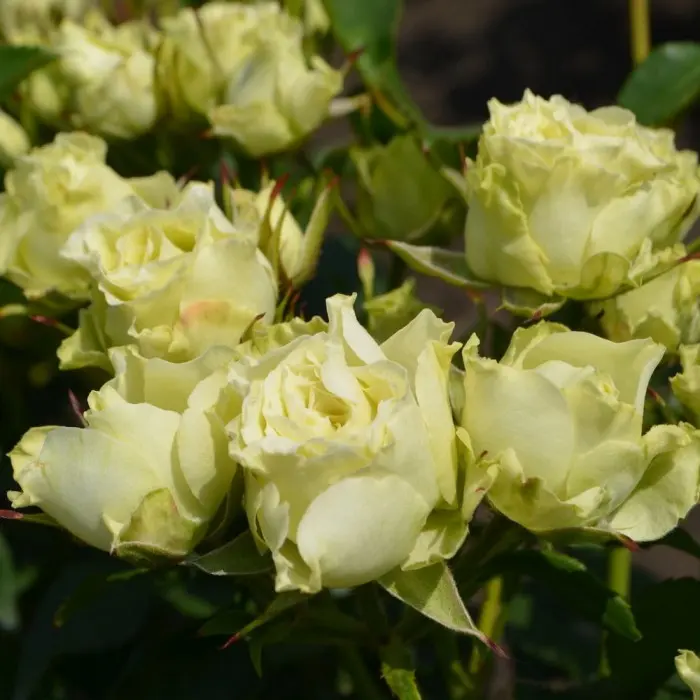 Роза спрей Лувиана. Высота куста: 60-70 см.; Диаметр куста: 40-50 см.; Диаметр цветка: 5-7 см.; Ароматичность: 2/3; Устойчивость к заболеваниям: 2/3; Погодоустойчивость: 3/3; Непрерывно цветущая (ремонтантная) роза редкой окраски. Цветение обильное: на одном стебле распускается до 12-15 цветков зеленой окраски, при этом внешние лепестки имеют более холодный тон, лепестки в центре бутона имеют цвет зеленого чая. Бокал очень высокий, распускается медленно и имеет высокий тургор, благодаря чему хорошо стоит в срезке. Лепестки по краю могут быть гофрированными. Листья крупные, зубчатые. Стебли имеют редкие шипы. Во время цветения источает уникальный аромат, напоминающий аромат чая мате.