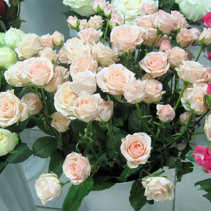 Роза Спрей Jana. Нежно-кремового цвета с 5 см бутонами, вмещающими до 35 лепестков. Размер бутона уступает одиночным видам, но из-за своей многочисленности на кусте восполняет с лихвой этот недостаток. Кисти вмещают от 3 до 5 цветочков. Высота куста колеблется от 0,5 м до 1 м, ширина около 0,5 м. Стебель вмещает на себе 3-5 бутончиков. Цветоносы состоят из 20-25 цветков и достигают длины около 0,5 м иногда даже больше. Аромат еле уловим.