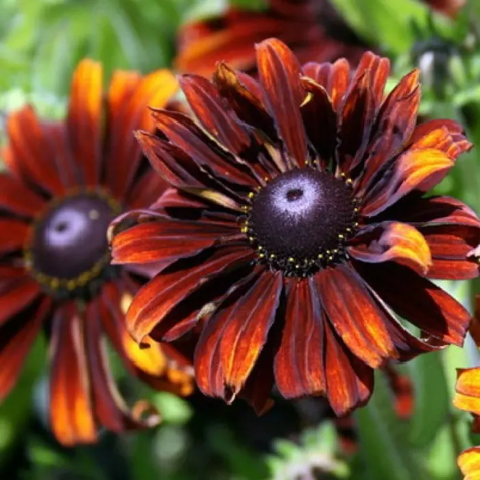 Рудбекия волосистая Moreno. Высота растения 65 см. Цвет красного дерева с ярко-оранжевыми кончиками лепестков. Растение жароустойчивое, формирует компактный куст, который идеально подходит для выращивания как в саду, так и в контейнерах. Цветение с июля до заморозков.