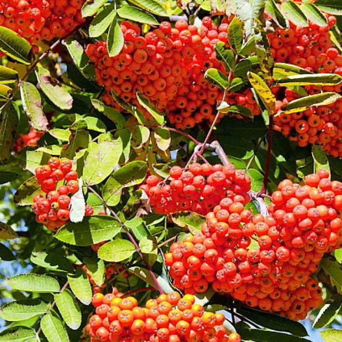 Побеги средней толщины, прямые, красно-коричневые. Листья крупные, непарноперистые, темно-зеленые, с зубчатым краем.