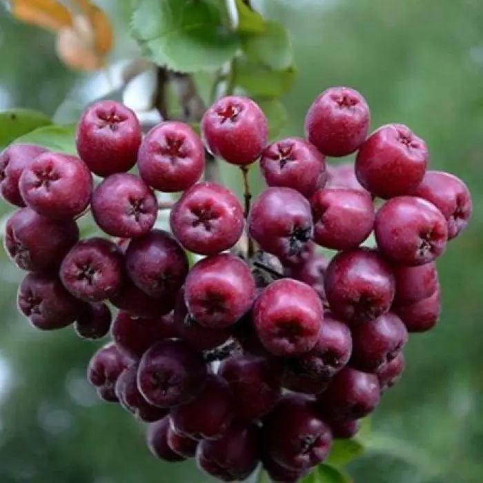 Декоративна во время цветения крупными щитками кремово-белых цветков, темно-зелеными перисто-рассеченными листьями с ярко-оранжевой осенней окраской и темно-бордовыми гранеными плодами. Рябина зимостойкая.