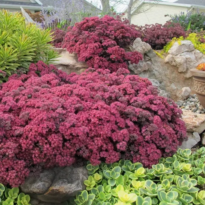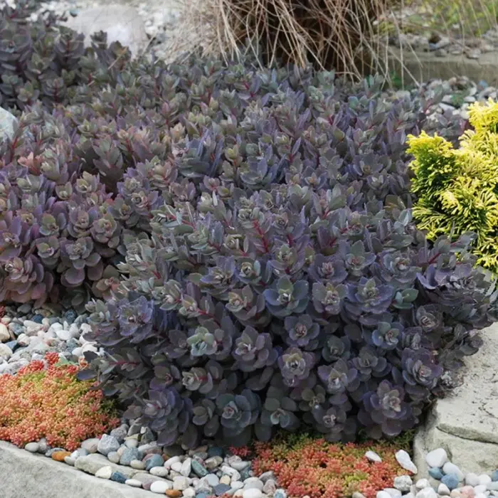 Седум (очиток) Dazzlebery Sunsparkler. Высота куста около 15-20 см., ширина около 45 см., высота цветоносов 25 см. Небольшие, серо-голубые листья практически не видны из-под больших соцветий ярко-вишневого цвета. Период цветения с июля по сентябрь. Зона морозостойкости (зимостойкость) 4 (до -35С).