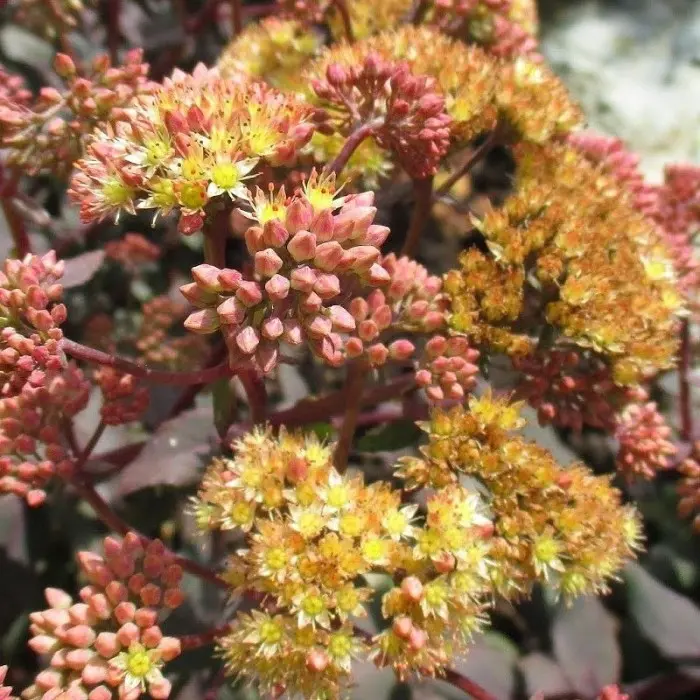 Очиток гибридный Yellow Xenox. Компактный очиток, отлично подходит для выращивания в контейнерах. Цветки вначале светло-жёлтые, затем светло-охряные. Листья плотные, мясистые, широкие, матовые, тёмные пурпурно-зелёные. Высота 40см. Место посадки: предпочитает солнечные места или легкая полутень. Зимует: без укрытия. Почва: любая садовая, окультуренная.