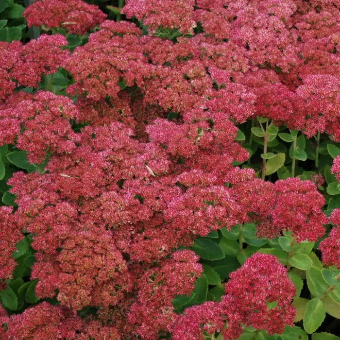 Очиток видный Autumn Joy. Компактное, эффектное многолетнее растение с яркими пурпурно красными цветами. Высота куста: 20-24 см, ширина соцветия 12-18 см. Этот прекрасный сорт цветет тогда, когда другие растения уже отцветают. Цветёт в августе-сентябре. Листья зеленые, сочные. Сильные, вертикальные стебли несут широкие куполообразные соцветия с маленькими, звездчатыми, красочными цветами. Соцветие плоское. Седум — многолетнее растение, которое прекрасно подходит для декорирования садовых участков. Они хорошо будут смотреться на садовых участках. Используют в массовых посадках или миксбордерах вместе с другими седумами или не высокими травянистыми многолетниками. Морозостойкий сорт.