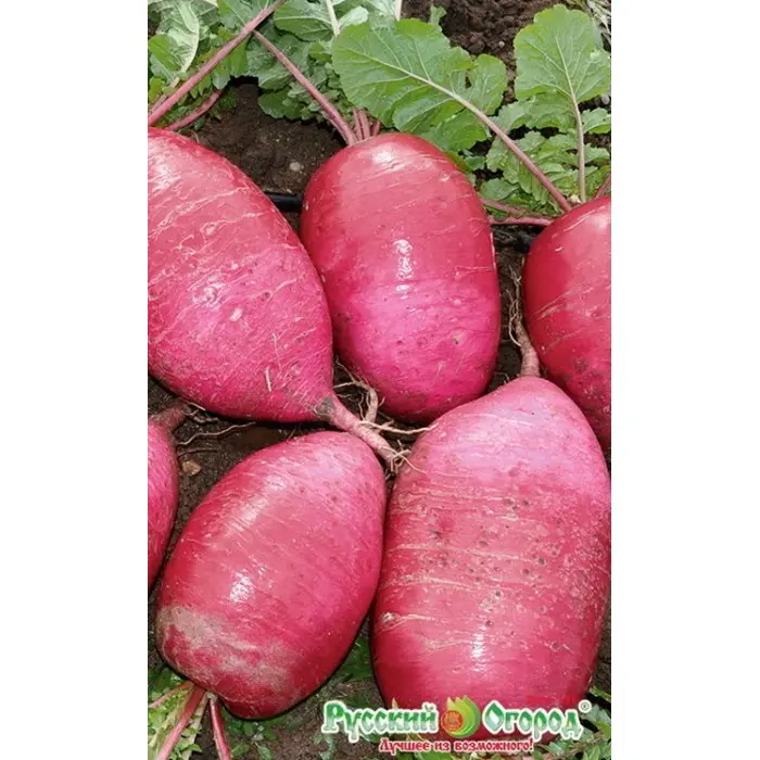 Дайкон Русский Размер Сверхредиска F1 – один из самых новых, но уже очень популярных гибридов! Данный сорт является раннеспелым, с момента посева проходит всего 35-38 дней до сбора урожая. Идеальный вариант для северных районов, где необходимы быстроразвивающиеся культуры, а также, если вам очень хочется быстрее собрать первый урожай на огороде и засеять грядки чем-то другим. При этом дайкон Русский Размер Сверхредиска F1 славится огромными размерами плодов – один такой корнеплод весит до 2 килограмм! Окрас плодов насыщенно-розовый, но мякоть внутри белая. Дайкон Русский Размер Сверхредиска F1 отличается повышенным содержанием сахара в плодах, поэтому он совмещает очень необычные вкусовые характеристики: и пикантность, и сладость. Как и любой другой сорт дайкона, он содержит огромное количество витаминов, аминокислот. Если вы ни разу не пробовали данный корнеплод – представьте, что по растерли совсем немного сахара на редиске, плоды которой не жесткие, но плотные и упругие. Такой вкус полюбят даже дети, а уж в приготовлении салатов ему и вовсе нет цены!