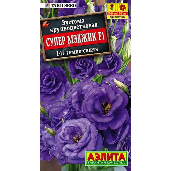 Эустома Супер Мэджик F1 темно-синяя крупноцветковая махровая. Потрясающая серия раннецветущих эустом от известнейшей японской компании TAKII SEED. Растения многолетние, но в умеренном климате их выращивают как однолетние. Мощные, высотой 70-90 см кусты с зеленовато-сизыми листьями и многочисленными бутонами цветут до заморозков. В срезке стоят до 3 недель. Рассада не любит травм корневой системы (предпочтительна перевалка, а не пикировка). Растения предпочитают полутень, умеренно влажную, плодородную почву и не переносят застоя воды.