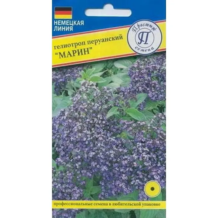 Гелиотроп перуанский Марин – одно из популярнейших садовых растений. Купить семена гелиотропа Перуанского Марин можно для летней душистой клумбы и для выращивания в качестве комнатного растения. Необыкновенный аромат сопровождает цветение гелиотропа. Культура лучше удается на открытых солнечных участках с питательной почвой. Высота куста – до 50 см. Форма листьев – узкие удлиненные листья имеют шероховатую поверхность. Окраска листьев – от темной зеленой до пурпурной. Окраска цветов – сиренево-фиолетовая. Форма соцветия – щиток, состоящий из множества мелких цветов. Аромат – медовый, сильный. Многолетник, но выращивается как однолетнее растение.