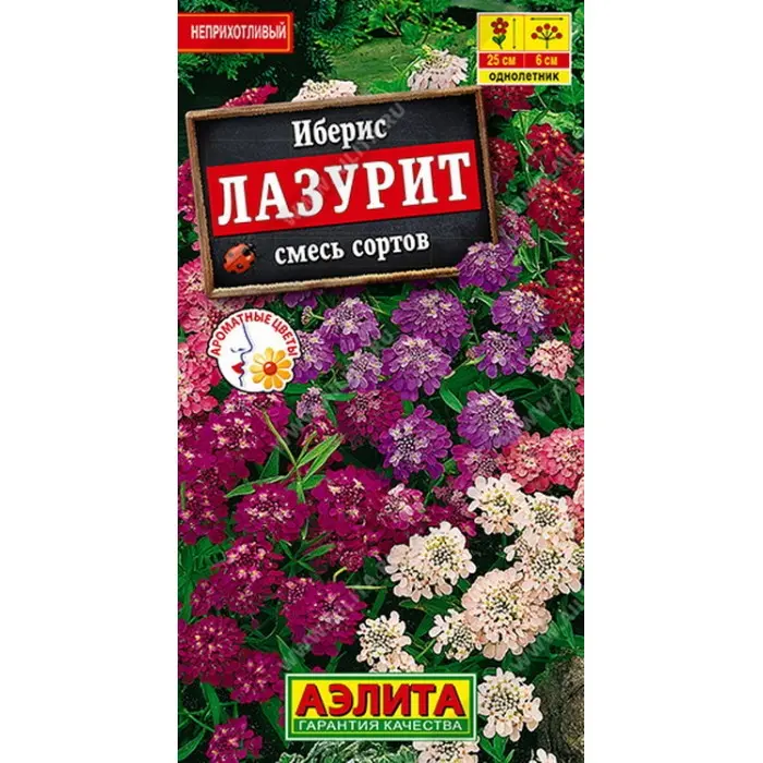 Иберис Лазурит, смесь сортов. Обильноцветущая, низкорослая смесь с сильным ароматом. Кустики компактные, хорошо разветвленные, высотой 20-25 см. Соцветия ? 5-6 см различных оттенков почти полностью закрывают листья. Смесь рекомендуется для бордюров, клумб, рабаток, альпийских горок. Прекрасно подходит для горшечной культуры и оформления балконных и садовых контейнеров.