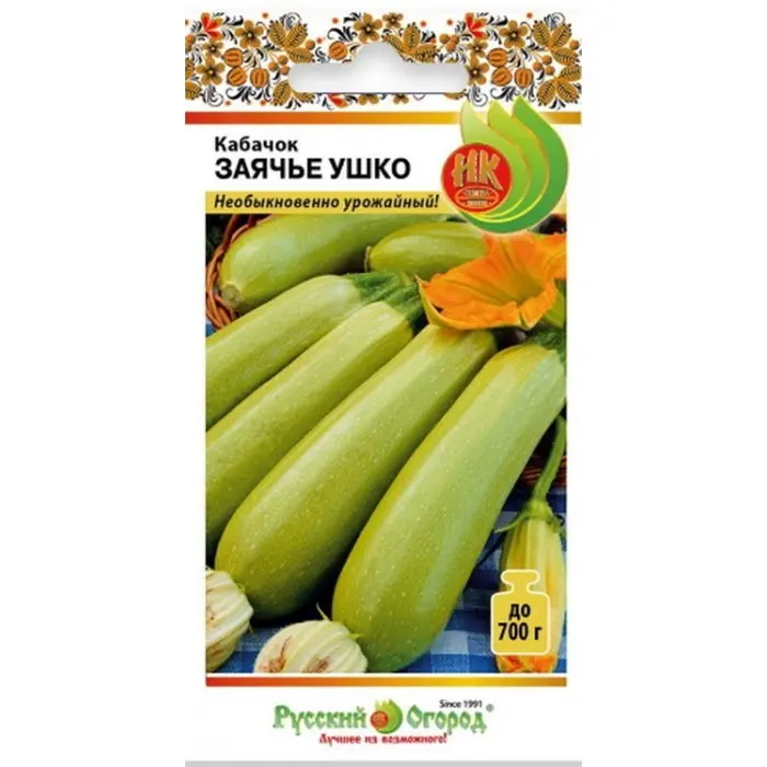 Это раннеспелый сорт, период созревания 45–50 дней. Плоды крупные, могут достигать веса до 1 кг, окрашены в светлый зеленовато-белый цвет, форма плода удлиненная, мякоть сочная, плотная. Главными достоинствами кабачка «Заячье ушко» являются прекрасные вкусовые качества и высокая урожайность.