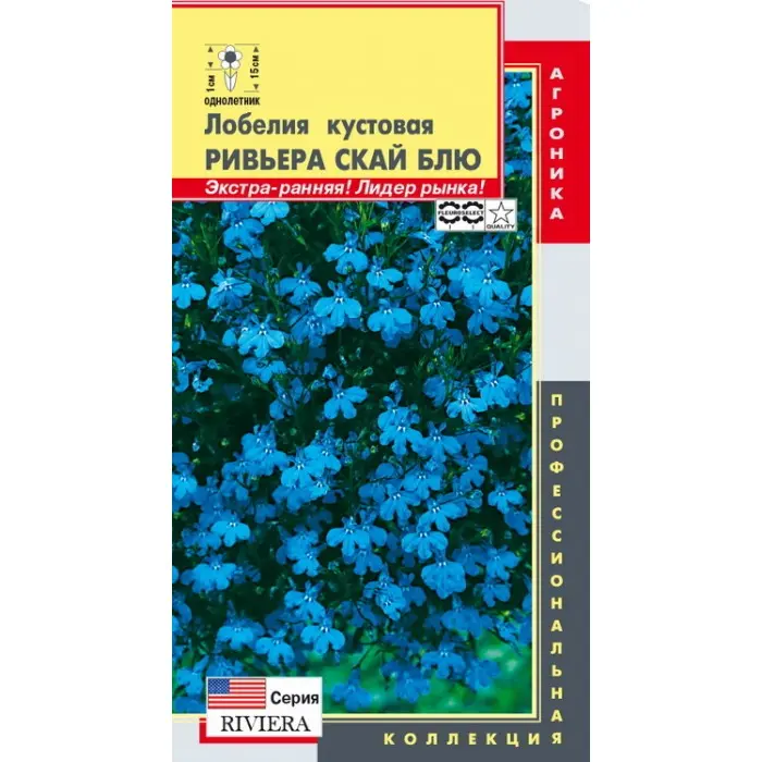 Лобелии серии Riviera уже много лет являются эталоном среди кустовых лобелий, ведь они сочетают в себе: экстра-раннее начало цветения (на 15 дней раньше других лобелий), широкий выбор расцветок (в том числе уникальных), продолжительное и обильное цветение, и все это вместе с неприхотливостью в выращивании дает им право называться «ЛИДЕРАМИ РЫНКА»! По мере роста, растение формирует компактный кустик шаровидной формы, высотой 13-17см, и до 20см шириной. В период цветения все растение покрыто одиночными небесно-голубыми цветками. Данная лобелия широко используется при бордюрной или ковровой посадке на клумбах, для выращивания в балконных ящиках и контейнерах. За счет раннего цветения, растения могут реализовываться в технологических кассетах уже в цветущем виде, для дальнейшей высадки на постоянное место.