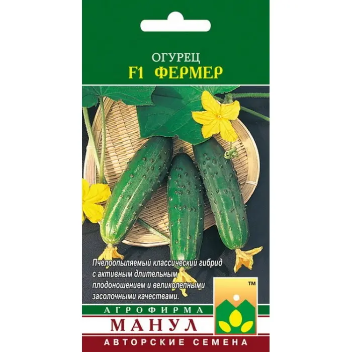 F1 Фермер - классический пчелоопыляемый гибрид преимущественно женского или женского типа цветения. Предназначен для открытого грунта, весенних теплиц, тоннелей. Ветвление среднее или выше среднего. В узлах формируется по 1-2 завязи. Зеленцы крупнобугорчатые, белошипые, длиной 10-12 см, плотные, хрустящие; засолочные и консервные качества очень высокие. Интенсивный рост растений, мощная корневая система, активное отрастание боковых побегов в сочетании с холодостойкостью и комплексной устойчивостью к болезням обусловливают продолжительное дружное плодоношение до осенних заморозков. Гибрид устойчив к мучнистой росе, оливковой пятнистости, вирусу обыкновенной огуречной мозаики, толерантен к ложной мучнистой росе. В посадки F1 Фермер добавляют 10 % опылителя.