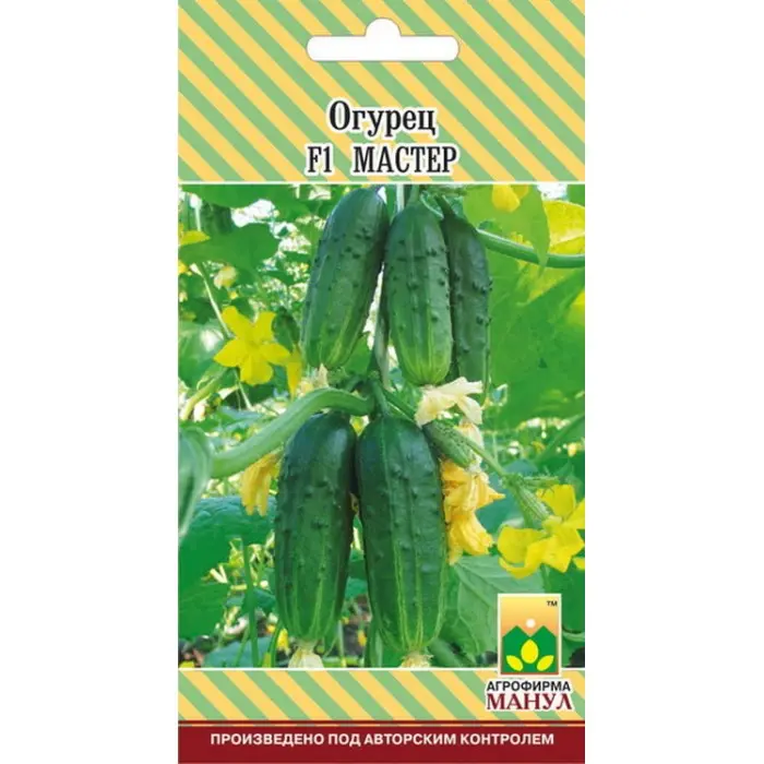 Огурец F1 Мастер – скороспелый партенокарпический пучковый корнишонный гибрид женского типа цветения. Предназначен для возделывания в весенне-летнем обороте в защищенном и открытом грунте. Ветвление ослаблено (растения формируют многочисленные боковые побеги с ограниченным ростом). В узлах формируется от 2-3 до 5-6 завязей. Зеленцы бугорчатые, белошипые, овально-цилиндрической формы, длиной 10-12 см, диаметром 2,6-3,5 см, массой 80-110 гр., плотные, хрустящие, ароматные. Частота расположения бугорков средняя, бугорки средней величины. Вкусовые качества свежих и соленых зеленцов высокие. Период плодоношения длительный. Гибрид устойчив к оливковой пятнистости, вирусу обыкновенной огуречной мозаики, мучнистой росе, толерантен к ложной мучнистой росе.