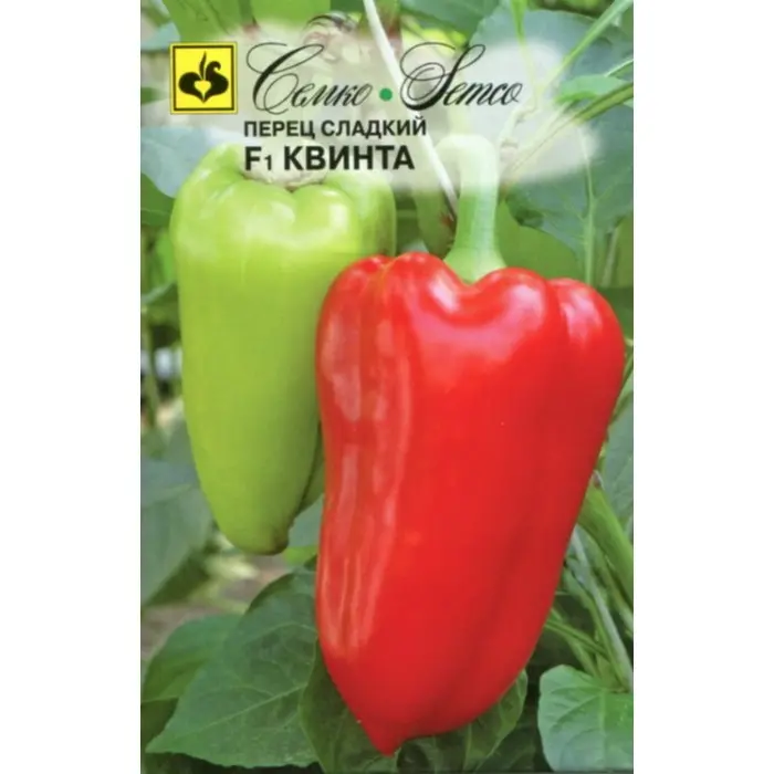 Перец сладкий Квинта F1 - ранний гибрид для открытого грунта и пленочных теплиц, в простонародье называемый болгарский перец. От всходов до технической спелости 95-105 дней, до биологической - 110-115 дней. Растение среднерослое, высотой 50-60 см, компактное, штамбовое. Перцы усечённо-пирамидальной формы с небольшой продольной ребристостью, 3-4-камерные, в технической спелости – светло-зелёные, в биологической – красные. Масса плода в технической спелости 90-110 г, в биологической – 130-160 г. Толщина стенки 6-8 мм, кожица плотная. Вкусовые качества отличные, содержание витамина С 140-150 мг%. Товарность и транспортабельность хорошие. Перец Квинта F1 относительно устойчив к вирусу табачной мозаики (TMV) и вертициллёзному увяданию (Va,Vd). Используется для потребления в свежем виде, консервирования, домашней кулинарии. Схема посадки 70х25 см. Урожайность в плёночных теплицах 7-9 кг/м2, в открытом грунте 5-7 кг/м2.