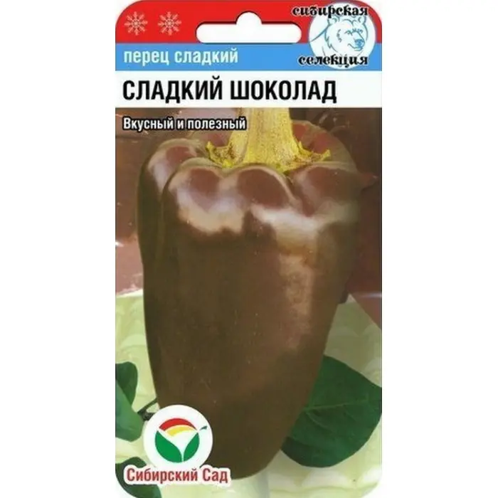 Новый интересный сорт перца сибирской селекции, в биологической спелости приобретающий настоящую шоколадную окраску. Сорт среднеспелый, куст высотой 70-80 см, формирует большое количество удлиненно-пирамидальных плодов с закругленным гладким кончиком. Окраска перца меняется от темно-зеленой до шоколадной, но изнутри зрелый плод красного цвета. Толщина стенки 5-6 мм, кожица нежная, вкус очень приятный и своеобразный, с горьковато-шоколадным ароматом.