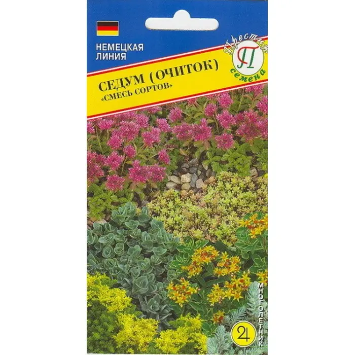 Смесь многолетних очитков. Миниатюрные, обильно цветущие почвопокровные растения, с многочисленными, ярко желтыми и ярко-Розовыми цветками-звездочками, которые образуют прекрасный контраст с зеленой, красной, желтой сверкающей листвой. Используется для создания "ковров" и в альпинариях, не заменим для закрепления склонов. Хороший медонос. Высота растения 8-10см. Посев на рассаду март-апрель или июль-август под зиму. Семена равномерно распределяют по поверхности увлажненного субстрата, слегка присыпают и ставят на свет. Но не подвергают воздействию прямого солнечного света. Всходы появляются через 9-14 дней при температуре 18-22 С. При появлении первых двух настоящих листьев пикируют в ящики или грядки. На постоянное место высаживают с шагом 40-50 см. Период цветения с июня по август. Неприхотлив к почвам, засухоустойчив. Не переносит затенения, при недостатке света перестает цвести.