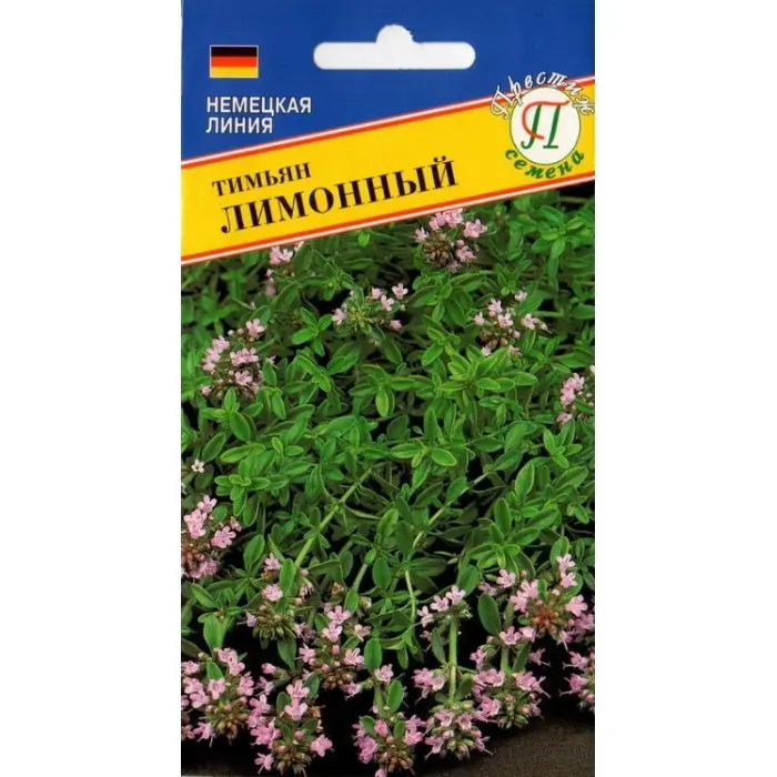 Тимьян ЛИМОННЫЙ Thymus L. Lemon. Семена немецкой фирмы "Satimex". Среднеспелый сорт с приподнятыми цветущими побегами, высотой 20-30 см. От всходов до первой срезки на зелень 25-35 дней. Облиственность средняя. Листья супротивные, мелкие эллиптические, серовато- зеленые. Цветки ярко-розовые или розовато-лиловые. Цветет с мая по сентябрь. Собирают стебли с веточками в период цветения. Ароматичность хорошая с горьковатым и жгучим вкусом. Используют в кулинарии, народной медицине.