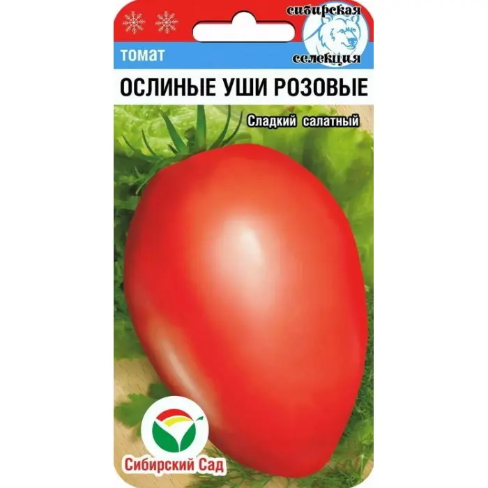 Вкусный среднеспелый сорт салатного назначения с розовыми плодами, по форме напоминающими ослиное ухо. Рекомендуется для выращивания в остекленных и пленочных теплицах. От высадки рассады до сбора плодов 115-120 дней.